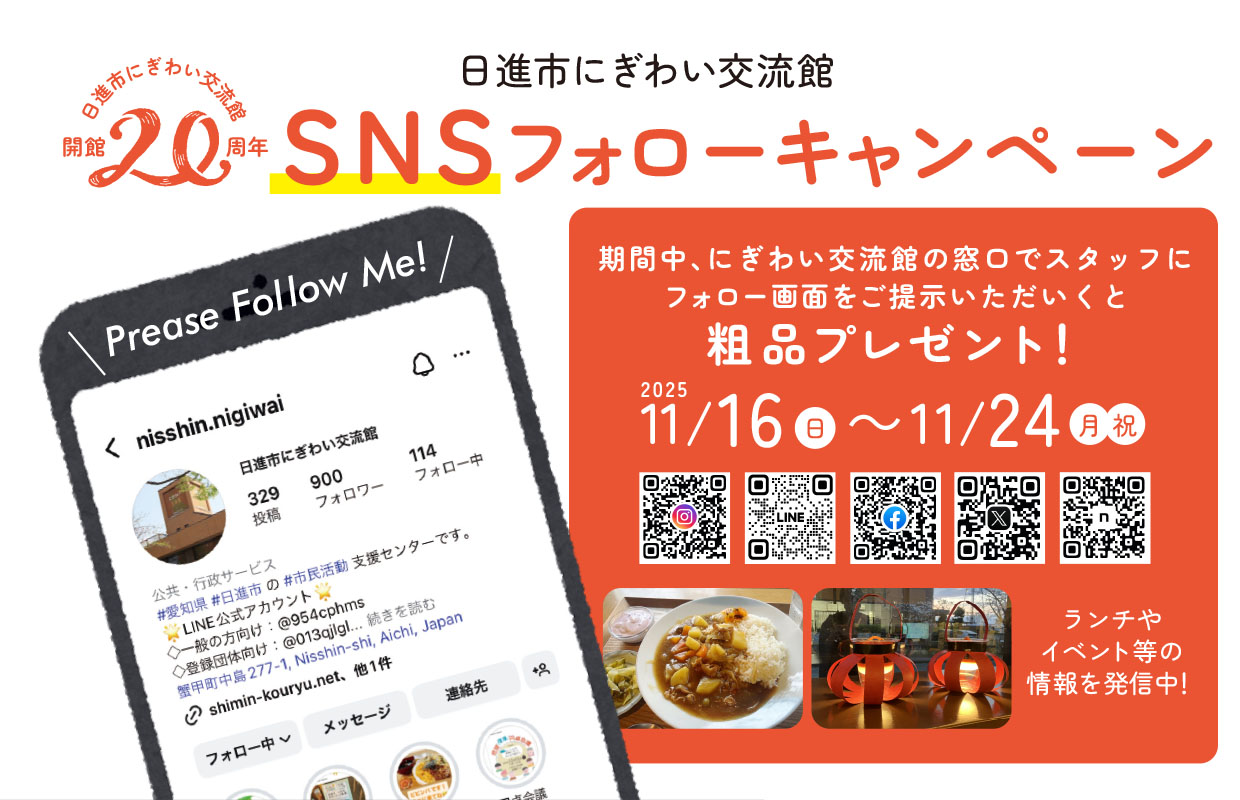 ▽ 期間中 ギャラリー展示「日進の市民活動20年を振り返る(仮)」/SNSフォローキャンペーン