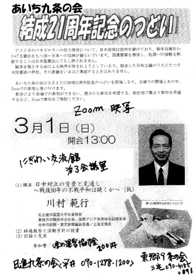 あいち九条の会は3月1日に結成21周年記念のつどいを開催します。