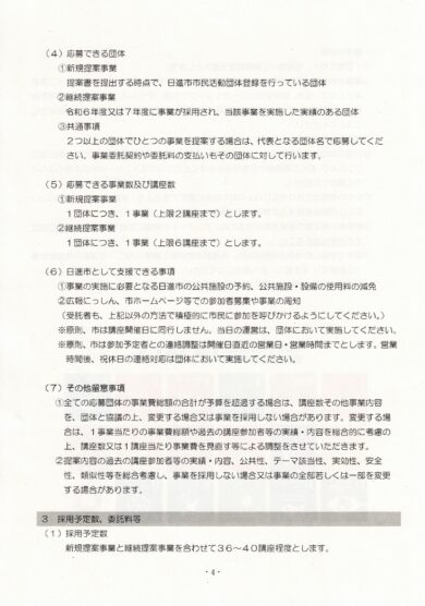 減免、 備品の貸出、市ホームペ ージや広報にっしん等での参加者の募集や