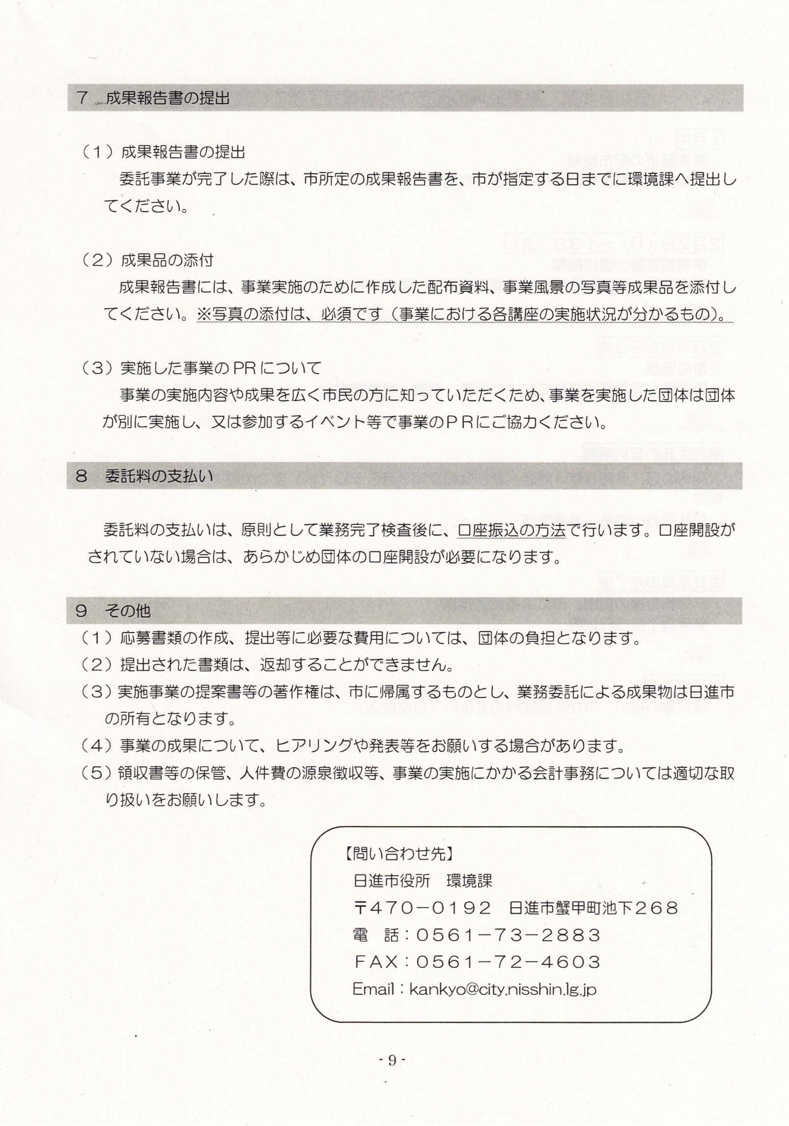 減免、 備品の貸出、市ホームペ ージや広報にっしん等での参加者の募集や